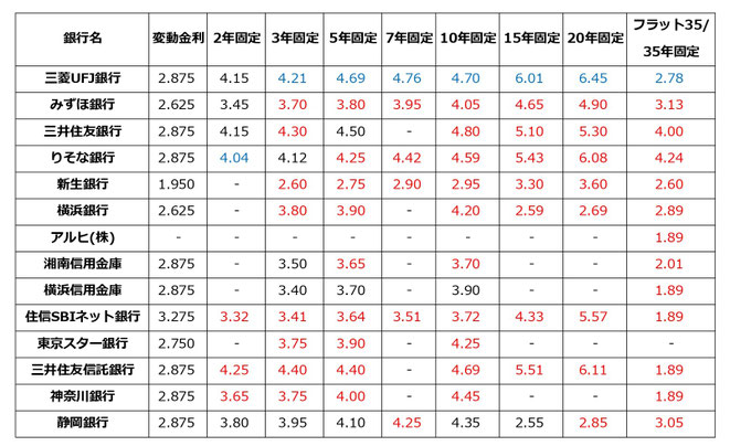 ・前月の住宅ローン金利と比較をして上がったものは赤字に、下がったものは青字に、変わらないものは黒字にしています。